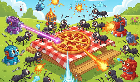 Prepárate para defender tu pizza en Ant Crusher, el juego en línea más emocionante donde hormigas astutas desafían tu estrategia. En este juego gratuito, construirás una defensa formidable utilizando una variedad de armamento avanzado para detener la imparable invasión de hormigas. Armado con cañones y otras herramientas poderosas, tu jugabilidad se centra en detener a estas decididas hormigas antes de que logren llevarse tus preciadas porciones de pizza!