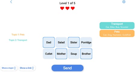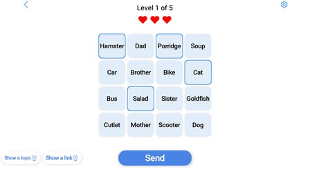 Para jugar Asociaciones-Pon a prueba tu cerebro!, simplemente comience eligiendo un nivel y lea las palabras que se muestran. Su tarea es encontrar las conexiones entre estas palabras y seleccionar las que pertenecen a la misma categoría o tema. En su computadora, use su mouse para hacer clic en las palabras que cree que están relacionadas. Si estás en tu teléfono, toca la pantalla para hacer tus selecciones. Cada selección correcta te recompensará con puntos, y puedes pasar al siguiente nivel si completas con éxito la ronda. Usa sugerencias cuando estés atascado para guiarte a través de niveles más difíciles.