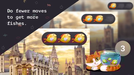 ¡Tu objetivo principal es recolectar 30 hermosas imágenes mientras minimizas tus movimientos para ganar un mayor número de peces y mantener al gatito sonriendo!