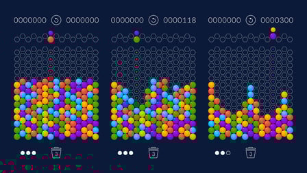 Para jugar a Bubble Bottom en tu ordenador, usa el ratón para apuntar y haz clic para disparar burbujas hacia el grupo que está arriba. Combina tres o más burbujas del mismo color para despejarlas y ganar puntos. Si juegas en tu teléfono, simplemente toca donde quieres que vaya la burbuja. Tómate tu tiempo; no hay apuros ni límites de tiempo, lo que te permite planificar cada movimiento cuidadosamente.