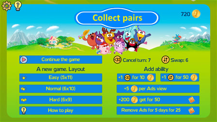 Comenzando Colecciona Pares es una brisa. Simplemente haga clic en las cartas para voltearlas y revelar los personajes de Kikoriki. Tu objetivo es hacer coincidir dos cartas idénticas para eliminarlas del campo. Continúe este proceso hasta que se encuentren todas las parejas y se despeje el campo de juego.