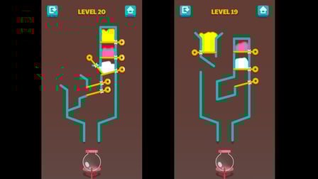 - Cada nivel presenta un nuevo rompecabezas con agua de colores y alfileres.