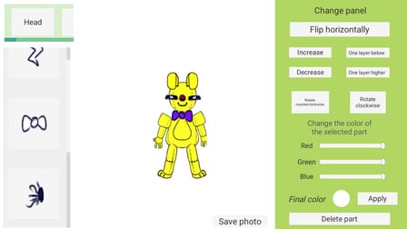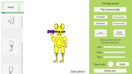 Creator of Animatronics es un emocionante juego casual en el que puedes construir tu propio robot animatrónico desde cero utilizando una gran variedad de piezas. Juega en línea gratis sin descargar y sumérgete en el mundo creativo de la animatrónica. Con más de 70 piezas diferentes disponibles, que incluyen cabezas, cuerpos, piernas, brazos, bozales, ojos y accesorios, puede dejar volar su imaginación. Cada parte se puede personalizar en varios colores y colocar en el escenario como desee. Tanto si eres fanático de la serie Five Nights at Freddy's como si simplemente te encanta crear personajes únicos, este juego ofrece infinitas posibilidades de creatividad. Disponible en plataformas de escritorio y Android, es perfecto para adolescentes y para cualquiera que disfrute de los juegos independientes y de sandbox.