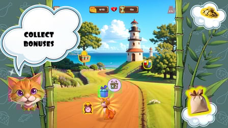 Embárcate en un emocionante viaje con Ginger, el gato rojo, mientras navegas por varios paisajes en busca de deliciosas golosinas. Domina los controles para mantener a Ginger ágil y rápido, asegurándote de que evite obstáculos y recolecte tantas golosinas como sea posible.