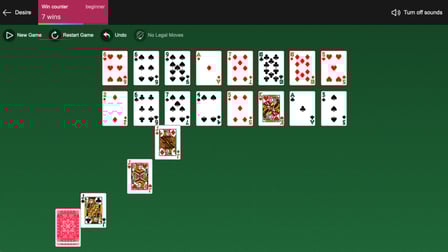 Desire Solitaire es un juego cautivador que requiere pensamiento lógico y paciencia. El objetivo principal es mover todas las cartas a las pilas de cimentación en orden ascendente. El diseño del juego incluye siete columnas con una baraja de cartas barajadas que debes organizar sistemáticamente. Con su jugabilidad simple pero desafiante, Desire Solitaire es perfecto tanto para principiantes como para jugadores experimentados. La interfaz del juego está diseñada para ofrecer una experiencia fluida y agradable, ya sea que se juegue en una computadora o en un teléfono.