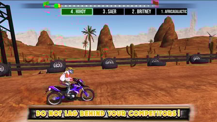 Dirt Bike MotoCross es un atractivo juego multijugador en línea en el que de 2 a 6 jugadores pueden competir en carreras en tiempo real. El juego presenta 15 secciones diferentes, cada una con terrenos únicos y desafiantes, que incluyen caminos de tierra, senderos nevados y paisajes verdes. El objetivo es ser el corredor más rápido y ágil, utilizando el terreno y los obstáculos a tu favor mientras mantienes el equilibrio y la velocidad. Con impresionantes efectos visuales y una jugabilidad inmersiva, Dirt Bike MotoCross promete una emocionante experiencia de carreras para todos los entusiastas de la bicicleta.