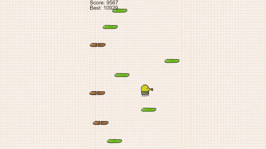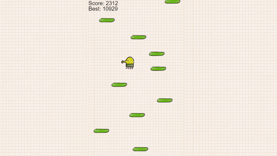Jugar a Doodle Jump implica usar controles simples para guiar al Garabato hacia arriba a través de una variedad de plataformas. Los jugadores pueden inclinar su dispositivo hacia la izquierda o hacia la derecha para mover al personaje en consecuencia, aprovechando sus reflejos y habilidades de salto. Cada salto impulsa el garabato más alto, y con la mecánica de gravedad única del juego, los jugadores deben maniobrar rápidamente para evitar caer de nuevo. Además, los jugadores pueden disparar a los obstáculos tocando la pantalla, eliminando las amenazas que bloquean el camino hacia puntuaciones más altas.