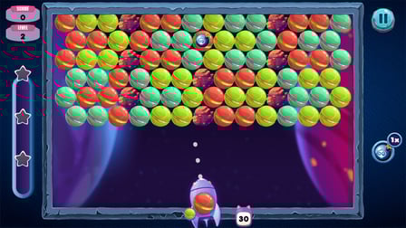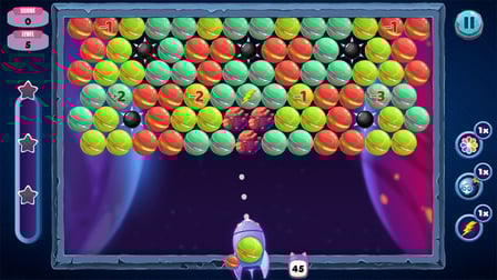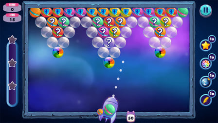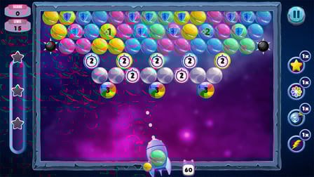- Varios tipos de burbujas y características especiales como bombas, arcoíris y estrellas.