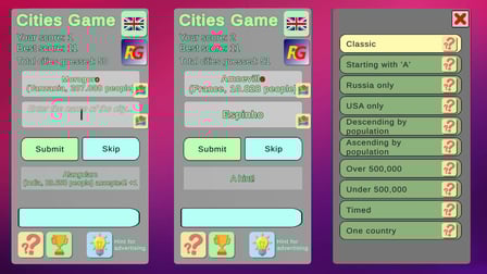 Adéntrate en el mundo vibrante de Classic Cities, un emocionante juego en línea que desafía tus conocimientos y habilidades de vocabulario. Participa en una emocionante carrera contra el tiempo, nombrando ciudades que empiezan con la última letra de la ciudad previamente mencionada. Este concepto único añade un giro emocionante, impulsándote a pensar rápido mientras compites contra jugadores de todo el mundo. Con cada nombre de ciudad correcto que proporciones, la jugabilidad se vuelve aún más emocionante mientras acumulas puntos y luchas por dominar la tabla de puntuaciones.