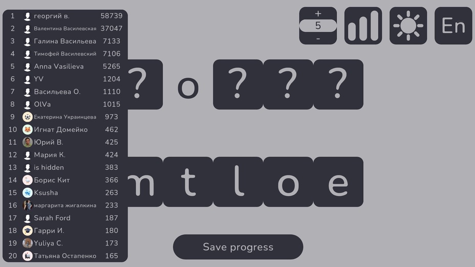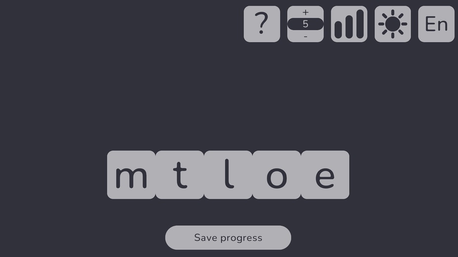 Estimula tu intelecto con Thousands of Words, un cautivador juego de anagramas que desafía a los jugadores a formar palabras a partir de letras revueltas. Este juego en línea está diseñado para elevar tu experiencia de juego, mejorando tu vocabulario mientras ofreces entretenimiento sin fin. Juega gratis directamente en tu navegador, ya sea en tu dispositivo móvil o en un ordenador.