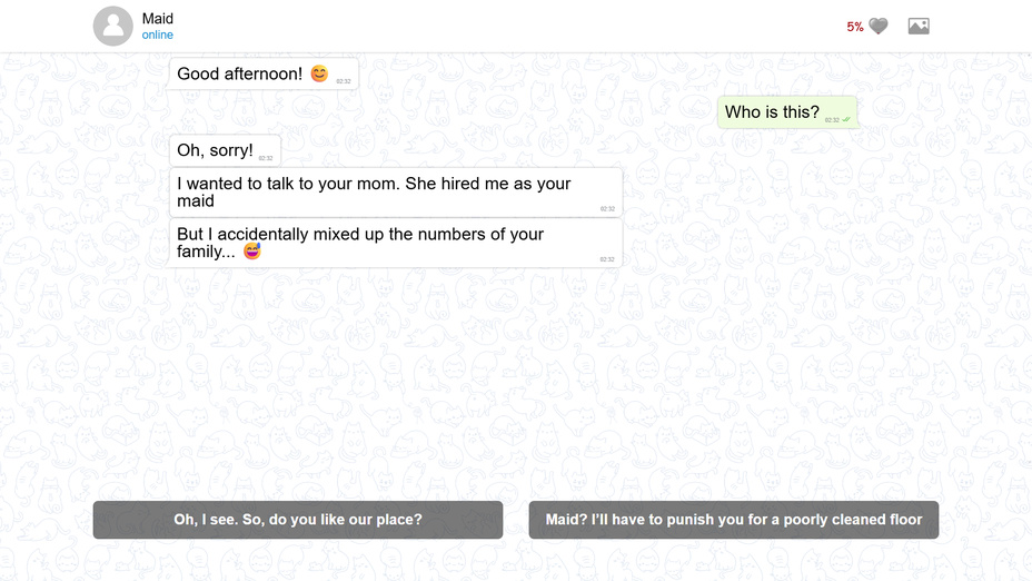 Usa tu ratón o pantalla táctil para seleccionar respuestas en las conversaciones. Cada elección es crucial, ya que influirán en tu relación con la sirvienta. Presta atención a sus respuestas emocionales después de cada interacción para decidir cuidadosamente tus próximas palabras.