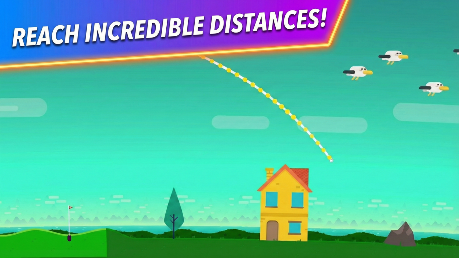The game exudes that polished hyper-casual energy—bright colors, exaggerated physics, and instant restarts that keep you in the "one more try" loop. The stylized cartoon art direction is intentionally clean and readable, stripping away visual clutter so you can focus purely on trajectory and timing. When your ball punches through a house or catches fire entering the Martian atmosphere, there's a primal satisfaction to it. The minimalist aesthetic keeps performance buttery smooth while the game throws increasingly absurd milestones at you (who doesn't want to golf on Mars?). It's silly, it's chill, and it doesn't pretend to be anything deeper than a perfectly engineered time-waster.