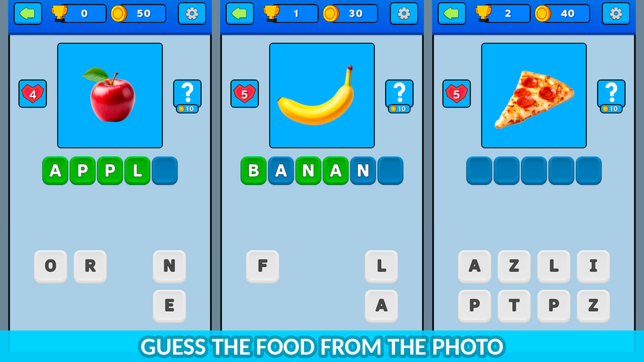 En su computadora, simplemente use el teclado para escribir su respuesta. En dispositivos móviles, toque las letras correspondientes en la pantalla para adivinar el alimento que se muestra en la imagen.