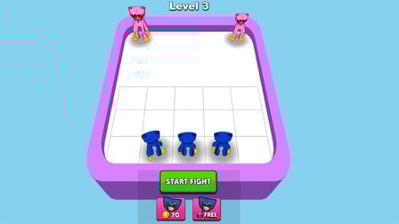 - Ratón: Haz clic para seleccionar y fusionar Huggy Wuggy y colocarlos en el campo de batalla.