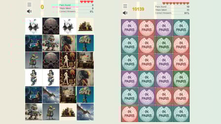 Prepárate para desafiar tu memoria y agudizar tu atención en In Pairs, un cautivador juego en línea que te empuja a descubrir tantas parejas coincidentes como sea posible de una interminable variedad de imágenes. ¡Sumérgete en esta experiencia emocionante que promete un juego gratis tanto en tu teléfono como en tu ordenador!