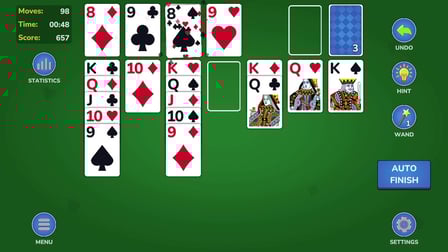 En un ordenador, haga clic y arrastre las cartas para moverlas, y use el mouse para seleccionar la pila de robo. En tu teléfono, simplemente toque las cartas para jugar; ¡la interfaz táctil facilita la administración de su mazo!
