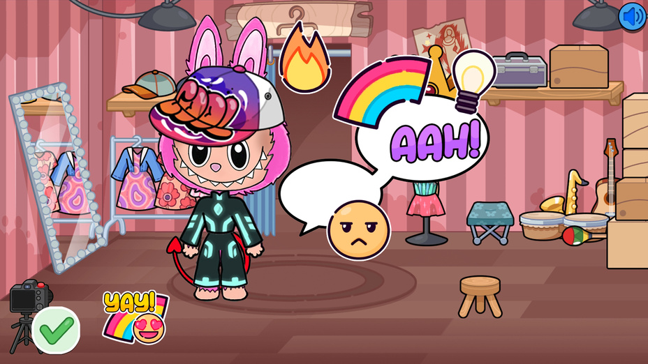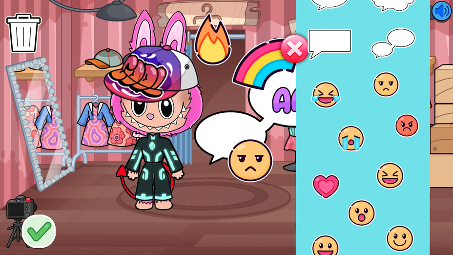 Para controlar tu experiencia de moda Labubu, haz clic o toca en los artículos del armario como tops, faldas, zapatos y accesorios. Usa la función de arrastrar y soltar para reorganizar los artículos o intercambiarlos rápidamente. ¡El botón "Cámara" toma una foto de tu estilo personalizado para compartir!