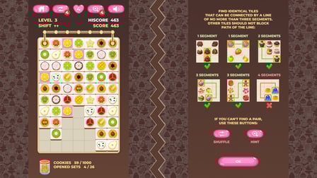 Comenzando con Mahjong Dulce Conectar es fácil. Simplemente haga clic o toque dos mosaicos coincidentes para conectarlos. Las baldosas deben tener un camino despejado entre ellas, que puede incluir hasta dos ángulos de 90 grados. Despeja todo el tablero para completar el nivel. El juego realiza un seguimiento de tu progreso, para que puedas pausar y reanudar cuando quieras.