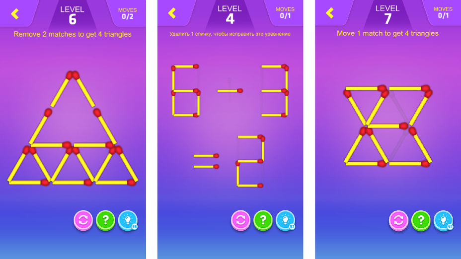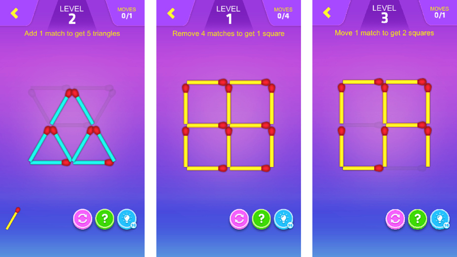 Matches Puzzle Game es un emocionante juego de bromas cerebrales en el que puedes eliminar, agregar o reorganizar coincidencias para resolver ecuaciones aritméticas o formar figuras geométricas. Juega en línea gratis sin descargar y sumérgete en el mundo de los acertijos lógicos. Este clásico juego de rompecabezas está disponible en computadoras de escritorio, Android e iOS, lo que lo convierte en una opción perfecta para los entusiastas de los rompecabezas que disfrutan de un buen entrenamiento cerebral. Ya sea que esté en casa o de viaje, Match Puzzle Game ofrece un desafío estimulante para todas las edades. Disfruta de la emoción de resolver acertijos de fósforos y mejora tus habilidades de pensamiento lógico.