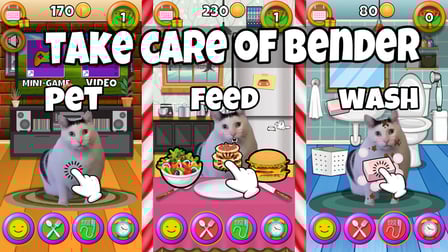 Sus controles principales incluyen clics o toques del mouse: haga clic en el tazón de comida para alimentar a Bender, haga clic en la bañera para bañarse y toque piezas de vestuario para vestirlo. Participe en minijuegos haciendo clic o tocando las indicaciones a medida que aparecen, lo que hace que cada interacción sea fluida.