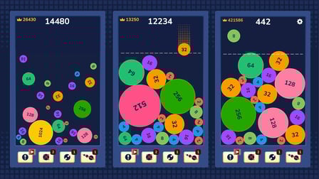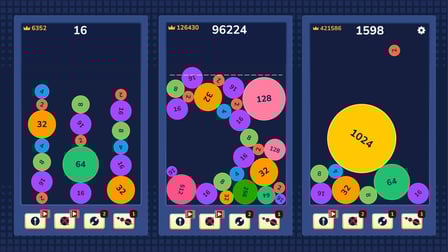 Para jugar a Merge 2048 - Powerups and Combos, simplemente usa tu ratón o dedo para tocar dos bolas coincidentes. Cuando dos números iguales colisionan, se fusionarán en una bola de número superior. Sigue fusionando para alcanzar el legendario 2048!