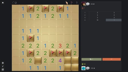 Entra en el emocionante mundo de Duelo Buscaminas, un giro moderno en el juego nostálgico que todos amábamos de niños. Esto gratis en línea el juego te invita a participar en electrizantes batallas uno a uno donde la estrategia se encuentra con la velocidad. Abra las celdas de su ordenador o móvil dispositivo y gana puntos en función de los valores de las celdas evitando minas. El jugador con la puntuación más alta al final del juego gana, ¡pero cuidado, tropezar con una mina significa una derrota instantánea—