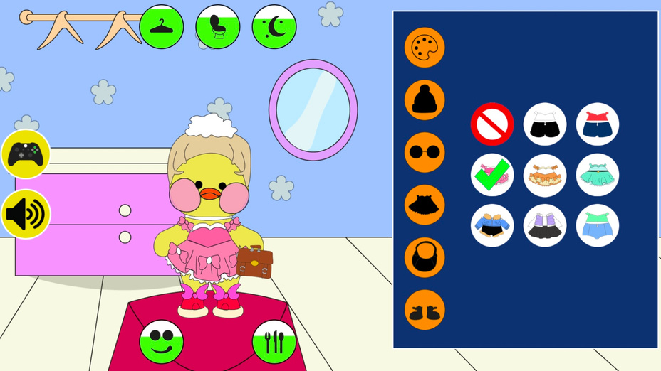 Embárcate en una aventura con Lalafanfan, tu adorable pato, explorando su mundo y satisfaciendo sus necesidades. Desde vestirla hasta alimentarla y administrar su rutina a la hora de acostarse, encontrará una gran cantidad de actividades con las que participar. Vigile sus indicadores de felicidad y responda a sus necesidades con prontitud.