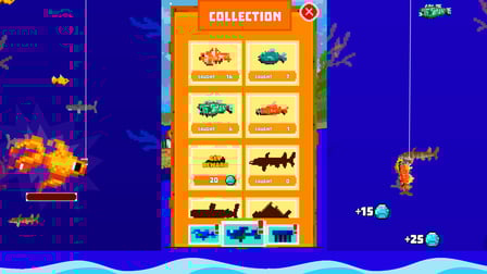 ¡Encontrarás una gran variedad de especies de peces enumeradas en tu colección, desde capturas comunes hasta raras, a medida que mejoras tu equipo y exploras diferentes profundidades!