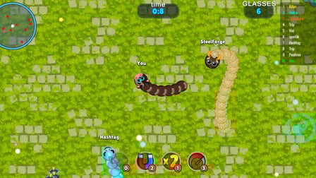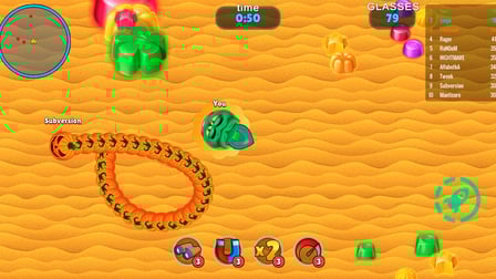 Jugar en línea Slither: Champion es fácil! Simplemente use las teclas de flecha para controlar su serpiente en una computadora o deslice la pantalla en su dispositivo móvil. El objetivo es navegar por la arena, recogiendo bolas de colores y creciendo evitando colisiones con otros jugadores. ¡Sé táctico, sé rápido y apunta a ser la serpiente más grande en la tabla de clasificación!