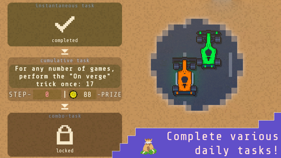 Las monedas se ganan al recorrer distancia, realizar maniobras arriesgadas y completar tareas diarias durante tu aventura de carreras.