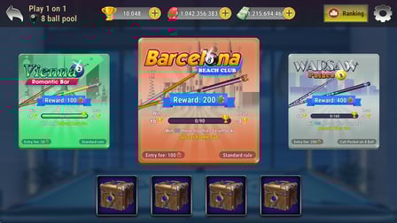 Pool Club ofrece cuatro modos de juego diversos que presentan un desafío único para cada jugador, incluyendo práctica, partidas casuales y juegos competitivos en línea.