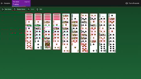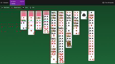 En Solitario Escorpión, tu objetivo es construir cuatro secuencias de cartas del Rey al As en orden descendente dentro del mismo palo. El juego comienza con un cuadro de 49 cartas dispuestas en siete columnas, y las tres primeras columnas contienen tres cartas boca abajo. Las cuatro columnas restantes están completamente expuestas. Este diseño presenta oportunidades y desafíos a medida que navegas por el juego.