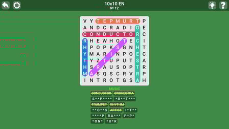Buscar palabras con Pistas es un emocionante juego de rompecabezas y casual en el que puedes desafiarte a ti mismo para encontrar todas las palabras sobre un tema determinado. Juega en línea gratis sin descargar y sumérgete en el cautivador mundo de la búsqueda de palabras. Con más de 150 temas diferentes, seguramente pondrá a prueba sus conocimientos en una amplia variedad de campos. Ya sea que esté pensando en las palabras relacionadas con " ¿Qué está de moda?"o simplemente quieres explorar un nuevo tema, este juego ofrece entretenimiento sin fin. Las palabras están dispuestas horizontal, vertical, diagonal y pueden cruzarse, agregando capas de complejidad y diversión. Elija su nivel de dificultad de fácil (una estrella), medio (dos estrellas), a difícil (tres estrellas) para que coincida con su conjunto de habilidades. Si alguna vez te encuentras atascado, el sistema de pistas está ahí para ayudarte revelando la primera letra o la palabra completa. Entonces, prepárese para embarcarse en una aventura de búsqueda de palabras que sea desafiante y gratificante.