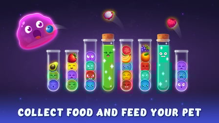 - Mantén feliz a tu mascota slime completando niveles y recolectando comida