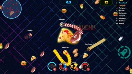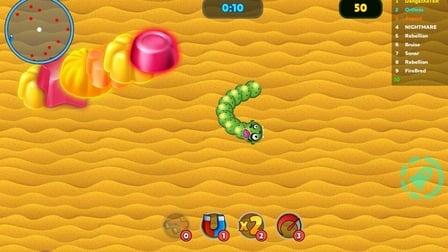 Puedes aumentar la longitud de tu serpiente recolectando alimentos esparcidos por la arena y usando bonificaciones sabiamente para ganar velocidad.