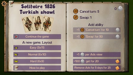 En Solitaire 1826 Turkish Shawl, tomarás el control de una sola baraja de cartas para resolver estratégicamente el diseño y despejar el tablero. El juego presenta un rico telón de fondo de la historia con ubicaciones únicas y una variedad de combinaciones de cartas para poner a prueba tus habilidades estratégicas. Sin restricciones de edad, es adecuado para jugadores de todas las edades que son fanáticos de los juegos de cartas. El innovador sistema de juego te reta a pensar varios pasos adelante, lo que lo convierte en un juego ideal para aquellos que aprecian un buen entrenamiento mental.
