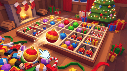 - Clasificación Match-3: Recoge tres juguetes navideños idénticos para eliminarlos.