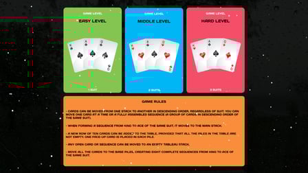 Para jugar a Spider Solitaire All Suits, necesitarás usar el ratón para arrastrar y soltar las cartas de una pila a otra. El objetivo del juego es construir columnas de cartas del Rey al As, de la misma pinta, para retirarlas del tablero. Puedes elegir entre tres niveles de dificultad, que variarán según el número de palos que debas completar. Utiliza la barra de espacios para acceder a las cartas de la reserva y recuerda que puedes cambiar el fondo del juego para personalizar tu experiencia. ¡No olvides activar la nieve para un toque festivo!