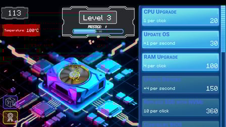 Para jugar Upgrade Your PC! en tu teléfono, simplemente toca el icono de CPU para ganar puntos. En tu computadora, utiliza el ratón para hacer clic repetidamente en el CPU. A medida que acumules puntos, podrás gastarlos para comprar varias mejoras, aumentando el poder de tu computadora. ¡Apunta a ganar puntos de experiencia (XP) para llevar tu nivel a 40 y completar el juego!