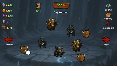 Les contrôles sont simples : cliquez sur votre souris ou tapotez sur votre téléphone pour générer de l'or. Utilisez cet or pour réaliser des améliorations et faire évoluer vos troupes de vikings vers des combattants plus puissants. Continuez à élaborer des stratégies alors que vous débloquez divers niveaux dans ce jeu captivant.