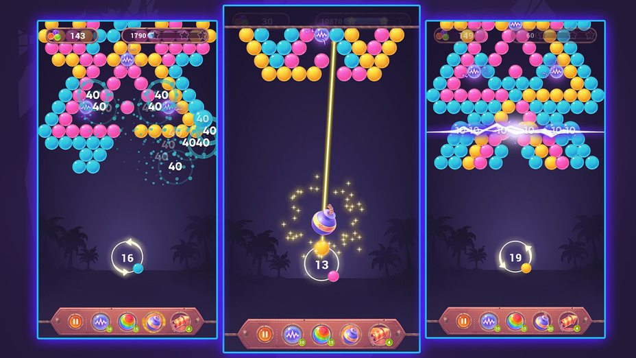 Maximisez votre score en visant des grappes de bulles de la mĂȘme couleur. Utilisez des murs pour faire rebondir des bulles dans des endroits difficiles d'accĂšs. Gardez un Ćil sur les bulles spĂ©ciales qui peuvent effacer de grandes sections de la planche. Ălaborez une stratĂ©gie pour vos mouvements afin de crĂ©er des rĂ©actions en chaĂźne pour de gros points et une complĂ©tion de niveau plus rapide.