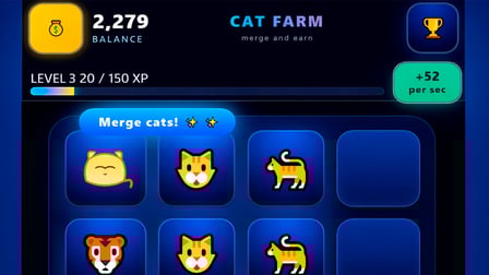 Ce jeu combine habilement les mécanismes de revenu idle avec un gameplay de fusion engageant, le tout enveloppé dans une esthétique chat joyeuse.