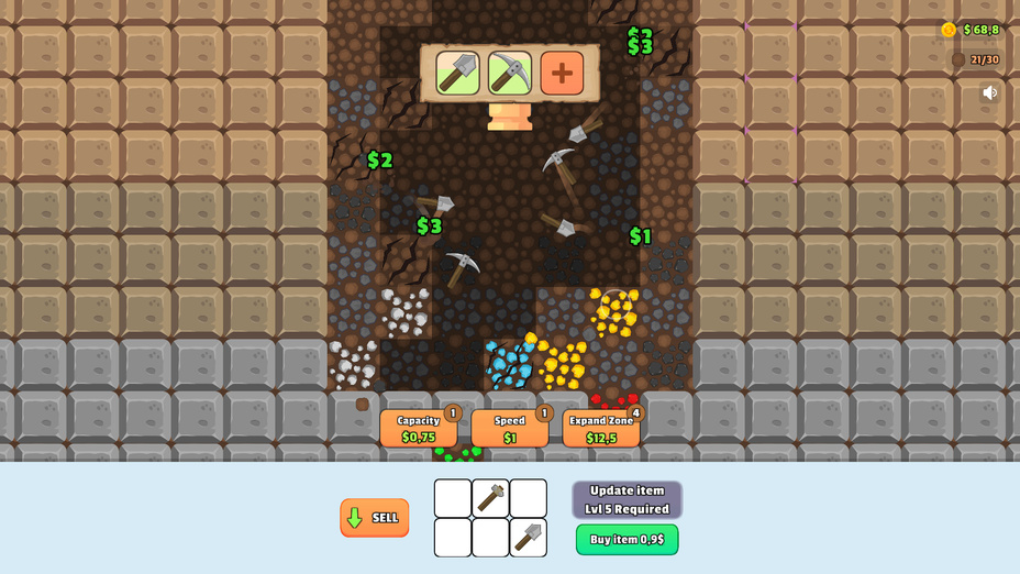 Concentrez-vous sur l'amélioration de votre pioche et priorisez les ressources de grande valeur comme l'or et les diamants pour une progression plus rapide.