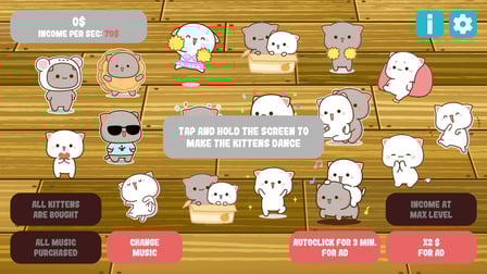 Actuellement, il n'y a pas d'achats en jeu dans les chatons dansants. Profitez de l'expérience complète gratuitement!