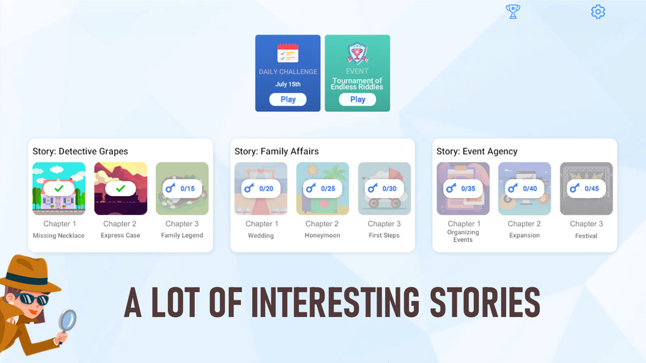 Embarquez pour votre voyage de détective en résolvant des énigmes logiques et en découvrant des indices. Utilisez des astuces pour guider votre chemin et accomplir les tùches quotidiennes pour progresser dans le jeu. Participez à des tournois pour tester vos compétences contre d'autres joueurs et débloquer de nouveaux cadeaux chaque jour.