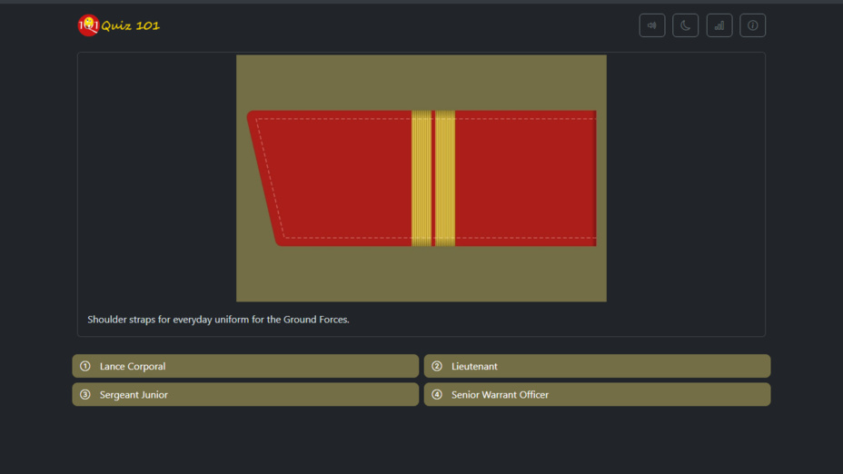 Améliorez votre gameplay grùce à ces conseils ! Faites attention aux détails de chaque insigne, certains éléments peuvent révéler leurs grades. Essayez également de mémoriser les drapeaux et les emblÚmes associés aux différentes branches des forces armées. Il est également utile de jouer au jeu avec le son activé pour renforcer votre mémoire des marches militaires et des mélodies pertinentes aux grades.