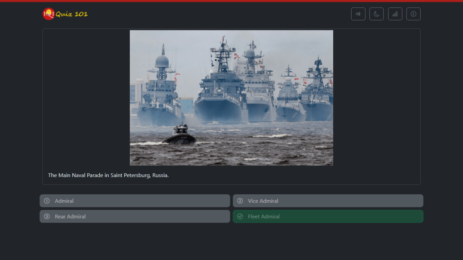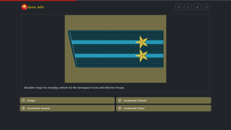 Entrez dans un monde fascinant des grades militaires avec Guess the Russian Shoulder Straps, un jeu quiz engageant qui teste vos connaissances sur les insignes de l'Armée et de la Marine russes. Parfait pour les passionnés d'histoire et les amateurs de quiz, ce jeu propose un accÚs gratuit à une variété de 101 questions. Progressez à travers le quiz en répondant en ligne sur les grades, les drapeaux et les insignes de col tout en profitant d'une expérience immersive enrichie par diverses marches militaires.