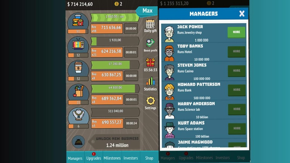 Magnate Clicker est simple à jouer mais nécessite un esprit stratégique à maßtriser. Commencez par ouvrir votre premiÚre entreprise et développez-vous progressivement en réinvestissant vos bénéfices. Le jeu est intuitif, ce qui permet aux nouveaux joueurs de saisir rapidement les mécanismes.