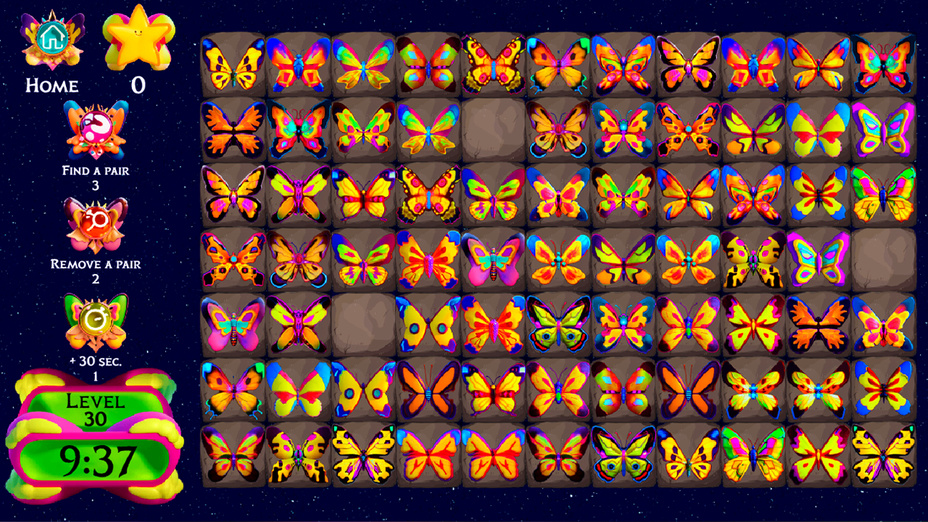 Maximisez votre score et progressez plus rapidement en gardant un Ćil sur les paires de papillons assorties. Utilisez des mouvements stratĂ©giques pour vider efficacement le tableau. Si vous vous retrouvez bloquĂ©, n'hĂ©sitez pas Ă utiliser le bouton Indice pour rĂ©vĂ©ler les mouvements disponibles. N'oubliez pas que chaque niveau est mĂ©ticuleusement conçu pour ĂȘtre rĂ©soluble, alors prenez votre temps et planifiez soigneusement vos mouvements. De plus, visez Ă gagner toutes les Ă©toiles de chaque niveau pour dĂ©bloquer de nouveaux papillons et progresser davantage dans le jeu.