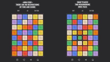 Dans Match-three: Non-stop, vous rencontrerez un terrain de jeu vibrant de 48 tuiles, rendu dans un style minimaliste apaisant pour les yeux. Que vous jouiez pendant une pause ou que vous passiez un après-midi détente, le mode nuit est un complément agréable, garantissant que vos yeux restent à l'aise pendant que vous jouez, quelle que soit l'heure.